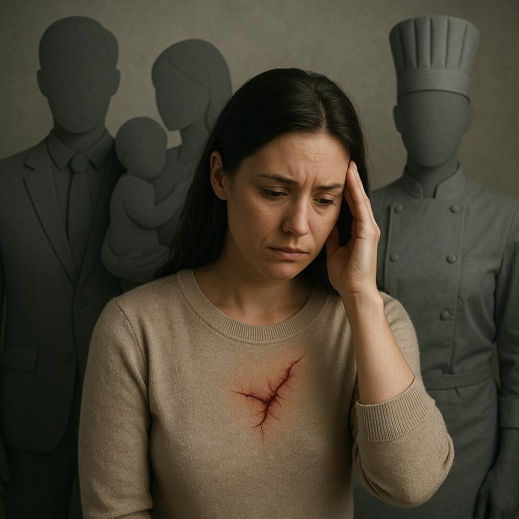 نخستین زخم، زخم بی‌هویتی است. زن، درگیر «بایدهایی» می‌شود که دیگران برایش نوشته‌اند: باید زیبا باشد، باید مهربان باشد، باید قوی باشد و هیچ‌گاه از خستگی‌هایش سخنی نگوید. این سیاهه‌ی تمام‌نشدنی، در نهایت او را در میان نقش‌های بی‌پایان—زن، مادر، همسر، دختر و دلبر—کم‌کم از خود واقعی‌اش جدا می‌کند. به راستی چه کسی از او می‌پرسد: «خودِ تو چه می‌خواهی؟ چه چیزی تو را خوشحال می‌کند؟»
