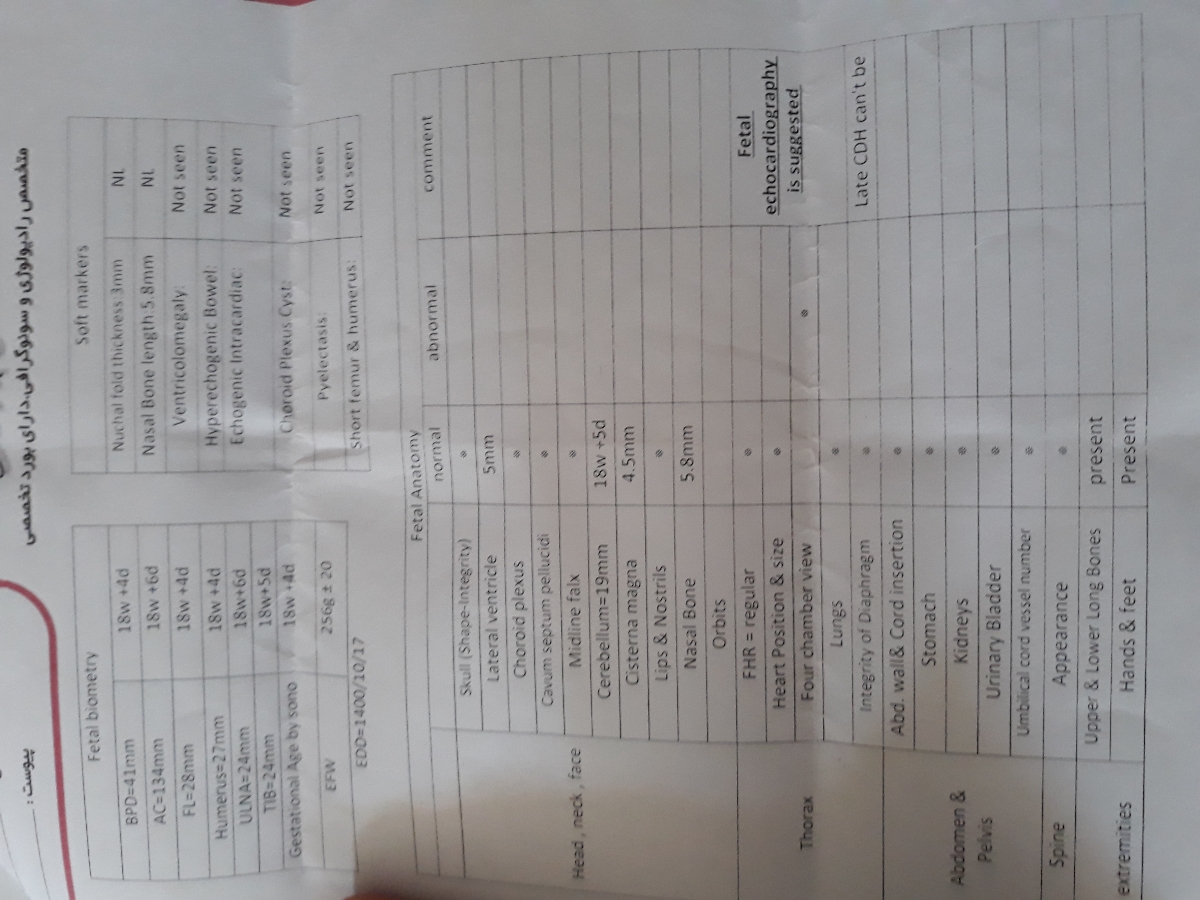 سلام میشه لطفا ب سنو نیگا کنید ببینید مشکلی نداره و چرا دکتر بم گفت پسر هست جنسیتش ولی تو برگه نوشته دختر بعد وزن جنین نوشته ولی قد جنین نتونستم ببینم