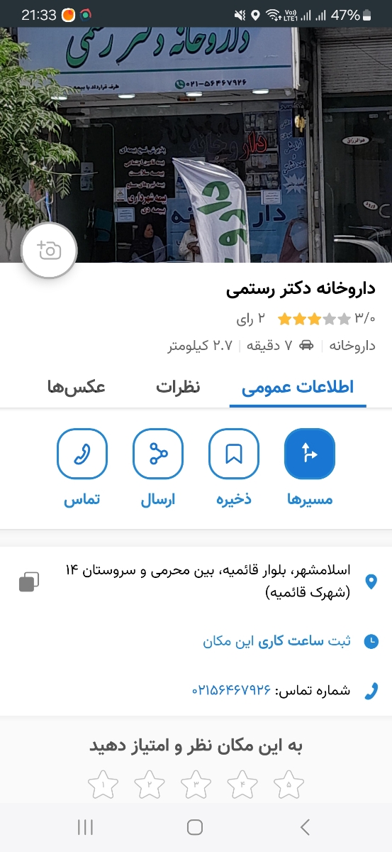 داروخانه دکتر رستمی تو قائمیه اسلامشهر داره